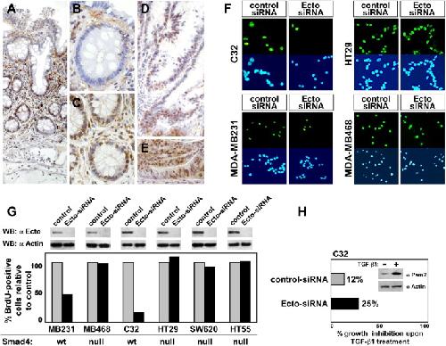 Figure 7. Ectodermin Controls Cell Proliferation via Smad4 (A–E) Immunohistochemical nuclear expression of Ectodermin in normal (A–C) and neoplastic (D, adenomas; E, carcinomas) human colon. (F and G) Effects of Ectodermin depletion on cell proliferation as measured by BrdU incorporation. Green is anti-BrdU; blue is Hoechst. (G) Smad4 is epistatic to Ectodermin. Columns show the effect of Ecto-siRNA depletion on cell proliferation (black bars) relative to control-siRNA-treated cultures (gray bars). The immunoblot lanes on the top confirm the quantitative knockdown of Ecto in each cell line. Only cells wild-type for Smad4, but not Smad4-null cells, are growth arrested upon Ecto downregulation. (H) Depletion of Ecto partially rescues the TGF-β1 (5 ng/ml) growth-suppressing activity in C32 cells. Inset: anti-phospho-Smad2 immunoblot shows that TGF-β1 signaling is effective in C32 cells. |