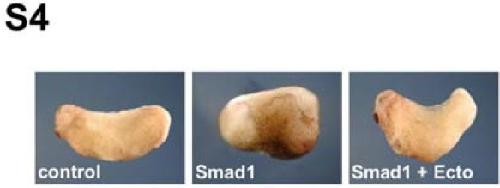 Supplemental Figure S4 Phenotype of tadpoles developed from embryos injected in the animal hemisphere at the 2-cell stage with Smad1 mRNA (1 ng) alone or in combination with Ecto mRNA (600 pg). Smad1 overexpression inhibits head formation (n=54, 72%) and this is rescued by Ectodermin (n=24, 12% headless). |