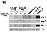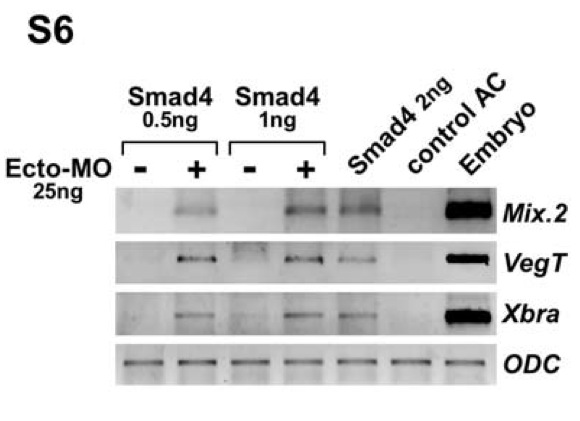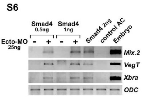 Supplemental Figure S6 A lower dose of Ecto-MO (causing a less efficient knockdown, data not shown) enables mesoderm induction by doses of Smad4 mRNA that are otherwise inactive. Two-cell stage embryos were injected with the indicated increasing doses of Smad4 mRNA alone or together with 25 ng of control-MO (-) or Ecto-MO (+). Animal caps were explanted at blastula and harvested for RT-PCR analysis . |