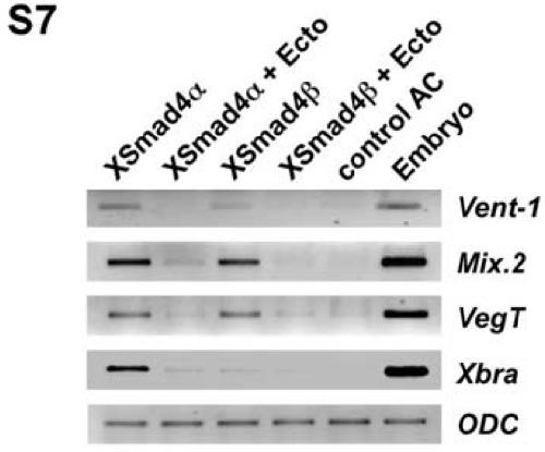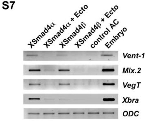 Supplemental Figure S7 Ectodermin inhibits mesoderm induction by XSmad4α and XSmad4β. Embryos were injected at the 2-cell stage with Xenopus Smad4 mRNAs (4 ng each) alone or with Ecto mRNA (1 ng). Animal caps were cut at blastula and harvested for RT-PCR analysis |
