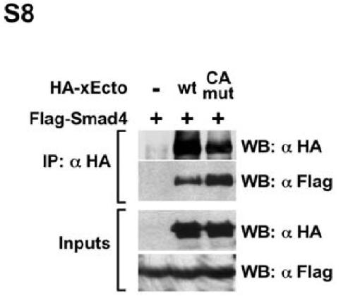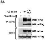 Supplemental Figure S8 Co-immunoprecipitation of proteins overexpressed in HEK293T cells showing that mutation of the RING finger of HA-tagged Ectodermin does not impair Flag-Smad4 interaction. Anti-HA western blotting of anti-HA pull-downs show comparable immunoprecipitation of Ecto wild-type and EctoCAmut proteins. Smad4 (anti-Flag WB) interacts similarly with both. |