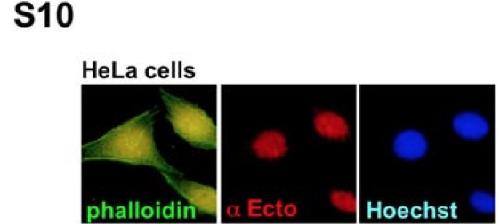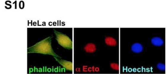 Supplemental Figure S10 Ectodermin is a nuclear protein in human cells. Immunofluorescent staining of endogenous Ectodermin protein in HeLa cells. Phalloidin marks the actin cytoskeleton and Hoechst the nuclear DNA, which overlaps with anti-Ecto immunoreactivity. |