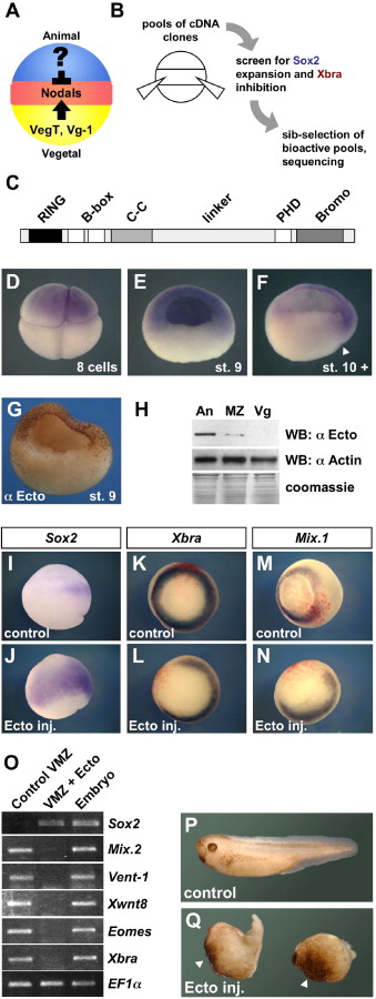 Figure 1. Functional Cloning of Ectodermin, a Maternal Determinant Regulating Cell Fates in Early Xenopus Embryos (A) Current model for the induction of primitive germ layers in Xenopus embryos. (B) Functional cloning strategy for candidate ectoderm determinants. (C) Schematic representation of the Ectodermin protein. The linker sequence is unique to Xenopus and mammalian Ectodermin (Ecto). Domains at the N terminus (RING finger, B boxes, coiled coil) and the C terminus (PHD, bromodomain) are shared with other members of the Tif1/TRIM protein family. (D–F) Expression analysis of Ectodermin by in situ hybridization. Arrowhead in (F) points to the dorsal lip. Embryos shown in (E) and (F) were bisected before in situ hybridization to allow penetration of the probe in the more vegetal regions. Controls for the in situs are provided in Figure S1. (G and H) Ectodermin protein is a localized determinant in the prospective ectoderm germ layer. (G) shows whole-mount immunolocalization of the endogenous Ectodermin protein on bisected blastula-stage embryos. Magnifications showing specific nuclear staining and additional controls are provided in Figure S1. (H) shows quantitative analysis of Ectodermin protein distribution along the animal-vegetal axis. Anti-Ectodermin immunoblot shows high enrichment of Ectodermin protein in explanted animal cells (An), low expression in marginal explants (MZ), and no expression in vegetal base (Vg), all explanted from blastula-stage embryos. Sibling explants were pretested by RT-PCR to verify their identity according to molecular markers. (I–N) Molecular characterization of the biological activity of Ectodermin by in situ hybridization. Sox2 is an ectoderm and neural plate marker; Xbra and Mix.1 are mesoderm markers. (I and J) Embryos at the four-cell stage were radially injected with Ecto mRNA (350 pg/blastomere) and harvested at the early gastrula stage (stage 10+). (K–N) Eight-cell-stage embryos were injected with Ecto mRNA (1 ng) in a single blastomere (marginal zone), together with lacZ mRNA (200 pg), to identify injected cells (in red). Embryos were harvested at the gastrula stage (stage 11). (O) RT-PCR analysis of marginal-zone explants (VMZ) expressing control (GFP mRNA, 1 ng) and Ecto mRNA (1 ng). Cells normally fated to express mesendoderm markers (Mix.2, Vent-1, Xwnt8, Eomes, Xbra) now change their fate, upregulating the ectoderm-specific marker Sox2. (P and Q) Long-term phenotypic effects of Ecto mRNA overexpression. Arrowheads indicate ruffled ventral epidermis. |