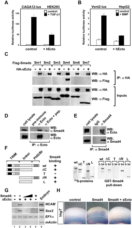 Figure 4. Ectodermin Binds Smad4 (A) Human Ectodermin inhibits TGF-β signaling. The CAGA12 luciferase reporter (100 ng) was transfected in HEK293T cells alone or in combination with human Ectodermin expression plasmid (500 ng) as indicated. After transfection, cells were either left untreated (white bars) or treated with 100 pM TGF-β1 (black bars). Doses are for transfection of 2 cm2 wells. Error bars are standard deviations. (B) Human Ectodermin inhibits BMP signaling. The Vent-2 BMP minimal responsive element (150 ng) was transfected in HepG2 cells alone or in combination with human Ectodermin expression plasmid (500 ng) as indicated. BMP signaling was provided by cotransfected CA-Alk3 and Smad1 expression plasmids. (C) Ectodermin interacts with Smad4 in vivo. Shown is immunoprecipitation (anti-HA antibody) of HEK293T cell lysates transfected with the indicated expression plasmids for different Flag-tagged Smad proteins and HA-tagged Xenopus Ecto. (D and E) A physiological complex between endogenous Ectodermin and Smad4 in HEK293T cells. pep indicates the Ectodermin immunogenic peptide competing for the antibody. (F) In vitro interaction between Ectodermin deletion mutants and Smad4. In vitro-translated 35S-Ecto fragments were incubated with bacterially expressed Smad4 as Sepharose bound GST fusion. Copurifying Ecto fragments were resolved by SDS-PAGE and visualized by autoradiography. The linker region of Ectodermin contains the Smad4 interaction domain. (G) RT-PCR analysis of cultured animal caps (harvested at stage 27) expressing the indicated mRNAs (dose in parenthesis). Lanes 2–4: the neural markers’ inductions (Sox2 and NCAM) by Ecto (400 pg) are downregulated by increasing doses of Smad4 (lane 3, 3 ng; lane 4, 6 ng). (H) In situ hybridization for the mesoderm marker VegT on embryos uninjected (control) or injected in a single blastomere at the four-cell stage with Smad4 mRNA (2.5 ng) alone or in combination with Ecto mRNA (800 pg). Pictures are lateral close-up views, with blastopore lip at the bottom. Dashed line indicates the normal upper limit of VegT expression. |