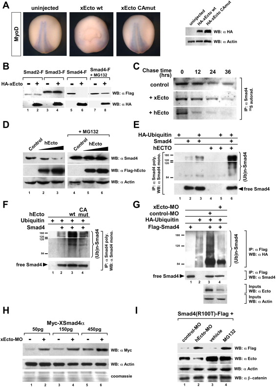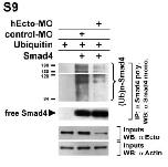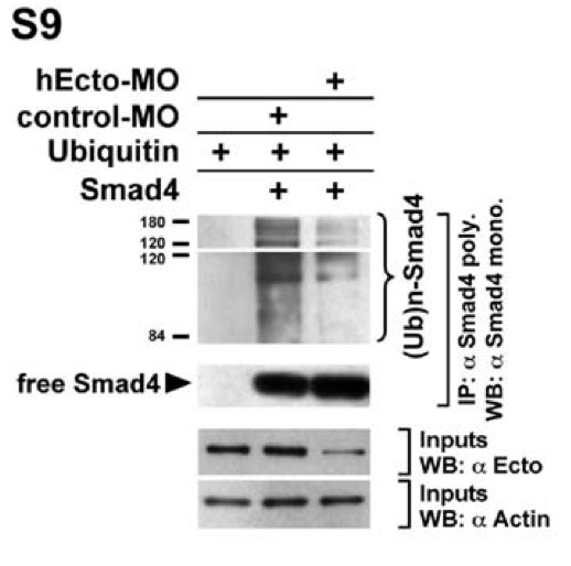 Supplemental Figure S9 Ectodermin is essential for Smad4 ubiquitination in human cells. Experimental conditions were as described in Figure 5G. Cells were co-transfected with control-MO or anti human Ecto morpholino (hEcto-MO) and the indicated expression plasmids. At the bottom, anti-Ecto and anti-Actin western blots of total lysates inputs to show downregulation of endogenous Ectodermin. |