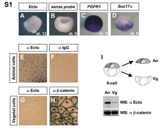 Supplemental Figure S1 (A) In situ hybridization for Ectodermin at stage 12. (B) In situ with Ectodermin sense probe gives no signal. (C) In situ for FGFR1, a ubiquitous mRNA, does not reveal substantial exclusion from vegetal cells. (D) In situ for Sox17α reveals specific staining of vegetal cells, with no background in the animal pole. All the embryos shown in (A-D) were bisected prior to the in situ hybridization procedure, which was carried out under the same conditions for the embryos shown in Figures 1D-1F. (E-H) Magnifications and controls for Ectodermin immunolocalization. (E) anti-Ecto- linker affinity purified antibody recognizes Ectodermin in the nucleus of animal cap cells. Of note, an identical localization of Ectodermin was found using a second affinity purified anti-Ecto antibody directed against a peptide of the linker region (data not shown). (F) The Secondary antibody alone gives no background. (G) anti- Ecto antibody gives no signal in vegetal cells. (H) the nuclear and membrane staining of β-catenin serves as a positive controls for our ability to detect vegetally localized determinants. (I) Ectodermin protein is already enriched in the animal blastomere by the 8-cell stage. |