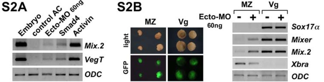 Supplemental Figure S2 (A) Ecto-depleted animal cap cells express mesoderm specific markers to levels comparable to those triggered by Smad4 mRNA injection (2 ng). Activin mRNA injection (20 pg) triggers stronger inductions. Quantitations of VegT inductions: Ecto- MO, 1X; Smad4, 2X; Activin, 32X. (B) Targeted depletion of Ectodermin from the prospective mesoderm leads to ectopic expression of endoderm markers. Eight-cell stage embryos were injected either in the marginal zone (MZ) or in the vegetal pole (Vg) with 60 ng of control-MO (-) or Ecto- MO (+) together with GFP mRNA as a tracer. At early gastrula, GFP-positive cells were dissected under the GFP-scope using Gastromaster wires (left panel shows representative explants before hasrvesting). RT-PCR analysis for Mixer and Mix.2 shows a specific effect of Ecto-knockdown in mesoderm cells (MZ), but not in vegetal explants (Vg) where Ectodermin is not expressed. RT-PCR analysis for Xbra and Sox17α proves absence of cross-contaminations in the explants. The effect of Ecto-MO in MZ explants was validated by immunoblot and found to be quantitative (data not shown). |