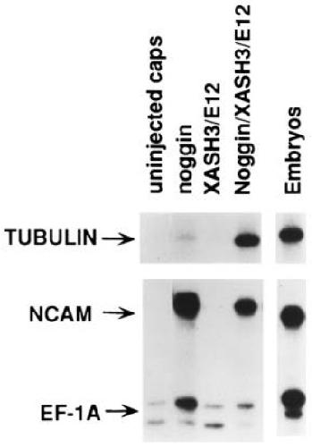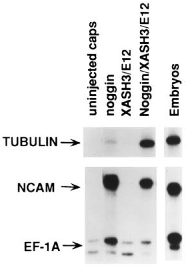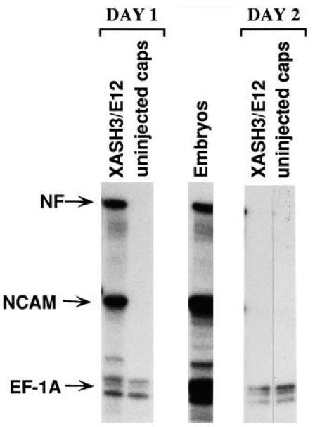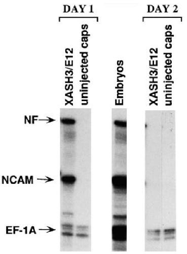 Neurofilament and NCAM are induced strongly in naive ectoderm by the injection of XASH-3/XE12 when the caps are assayed 1 day after the injection (lane a). If the caps are cultured for a second or third day, the level of these neural genes is dramatically reduced (lane d). Control caps (lanes b and e) show no neural gene expression on day 1 or 2. This experiment was repeated at least three times, and although there was some variation in the extent of the decrease in NCAM and NF expression XASH-3/XE12 induced caps, the decrease was always dramatic by 3 days.
