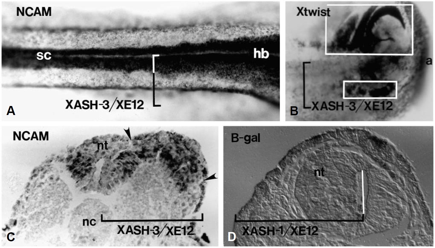 white boxes) on the XASH-3/XE12-injected right side (brackets). Anterior (a) is to the right. (C) A section through the spinal region of an