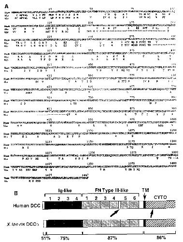 FIG. 1. Comparison of the predicted open reading frames of the human and Xenopus DCC eDNA sequences. (A) The amino acids (in single