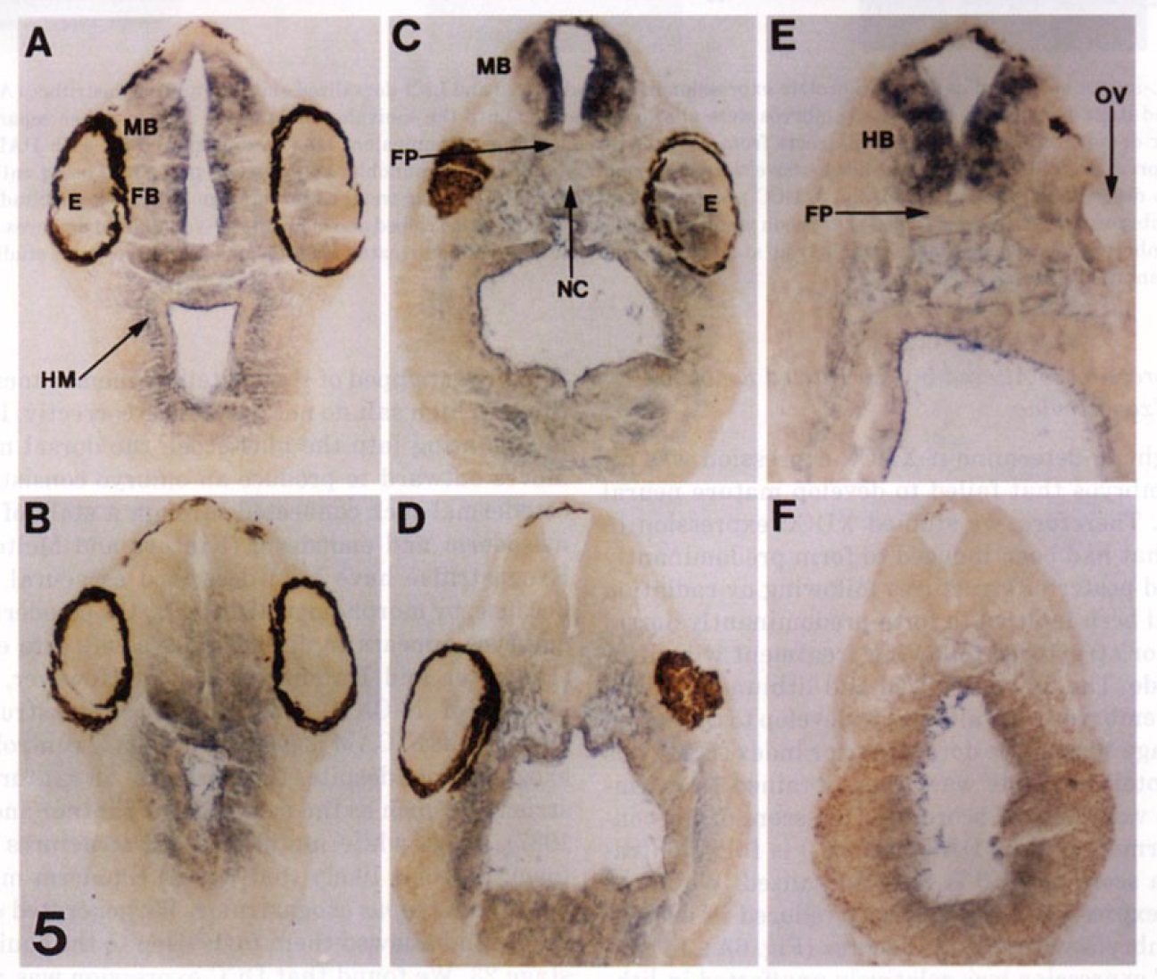 anti-senseXDCCa probe was seen in the headmesenchyme (HM), notochord (NC), or Floorplate (FP). The otic vesicle (OV) also failed to react