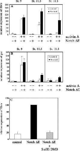Fig. 1. The effect of Notch signaling on activin-induced Xbra and goosecoid expression. Animal caps injected with 1 ng of Notch ΔE were dissected at stage 9, 10.5, and 11.5, and then treated with 10 ng/ml of activin A, followed by incubation for 5 h. The relative Xbra (A) and goosecoid (B) expression levels were calculated using real-time RT-PCR. (C) Animal caps injected with 1 ng Notch ΔE alone or co-injected with 1 ng Notch ΔE and 1 ng Su(H) DBM were dissected at stage 11.5, and then treated with 10 ng/ml activin A, followed by a 5-h incubation. The relative Xbra expression level was calculated using real-time RT-PCR. The efficiency of cDNA synthesis was assessed on the basis of real-time RT-PCR for ODC. The results represent the mean from three or four independent experiments and error bars indicate the SEM. Black column, Notch ΔE-injected animal caps; White column, uninjected control animal caps, Gray column, Notch ΔE and Su(H) DBM-injected animal caps.