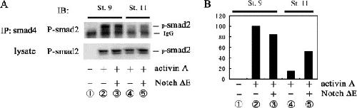 Fig. 4. The effect of Notch signaling on formation of a complex formation between C-terminal-phosphorylated smad2 and smad4. Animal caps injected with 1 ng of Notch ΔE (lanes 3 and 5) or control animal caps (lanes 1, 2 and 4) were dissected at stage 9 (lanes 1, 2 and 3) or stage 11 (lanes 4 and 5), and treated with 50 ng/ml of activin A. Lysates were immunoprecipitated with anti-smad4 antibody (IP) and western blotted with αp-smad2C antibody. The level of smad2 C-terminal phosphorylation was quantitated and the values plotted.