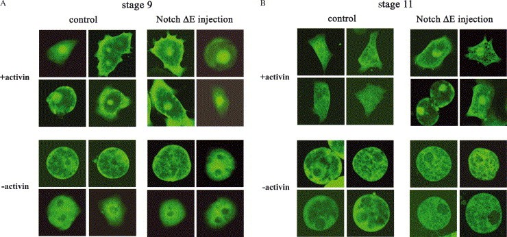 Fig. 5. The effect of Notch signaling on smad2 nuclear accumulation. Animal caps were injected with 500 pg of GFP-smad2 alone or co-injected with 500 pg of GFP-smad2 and 1 ng of Notch ΔE, and dissected at stage 9 (A) or stage 11 (B), and then dissociated in dissociation medium. Dissociated animal cap cells were treated with 5 ng/ml activin A for 30 min and then loaded onto a fibronectin-coated slide. The localization of GFP-smad2 was analyzed by confocal microscopy.