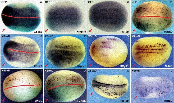 whole-mount TUNEL (D, I, J, L) and in situ hybridization with probes specific for XSox2 (A, E), XNgnr1 (B, F), XMyT1 (G) and N-Tubulin (C, H, K) as