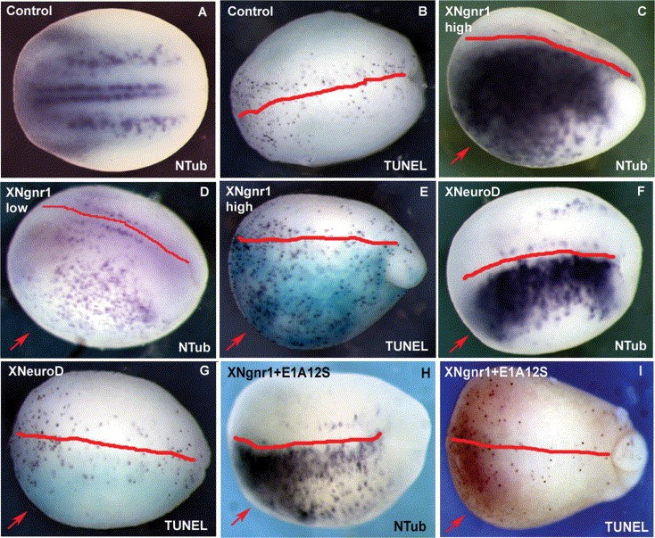 Fig. 2. Consequences of overexpression of neurogenic bHLH proteins on primary neurogenesis and early neural cell death. All embryos are shown in the dorsal views with anterior to the left, except for (C) and (D) which are shown in the dorso-lateral view. The dorsal midline is indicated in red (B). (A, B) Control embryos. (C) Embryos were microinjected with: (C, E) XNgnr1 (10 pg/nl) and GFP (50 pg/nl), (D) XNgnr1 (0.5 pg/nl) and GFP (50 pg/nl) (F, G) XNeuroD (100 pg/nl) and GFP (50 pg/nl) and (H, I) XNgnr1 (10 pg/nl) and E1A12S (0.2 pg/nl) and GFP (50 pg/nl) mRNAs as indicated in the top left corner (as in Fig. 1). Ngnr1 lowand Ngnr highdistinguishes the different doses of XNgnr1 microinjected. The injected half is shown as the bottom half (red arrow) in all injected embryos and was visualized by immunocytochemistry with anti-GFP antibodies, which resulted in the blue-green coloration. Immunocytochemistry staining using FAST-RED (Roche) was washed off to allow better visualization of in situ hybridization and TUNEL (D, G, H). Embryos were also subjected to whole-mount TUNEL (B, D, G, H, K, M) and whole-mount in situ hybridization with probes specific for (A, C, E, I, J) N-Tubulin, (F) XNgnr1 as indicated in the bottom right corner.