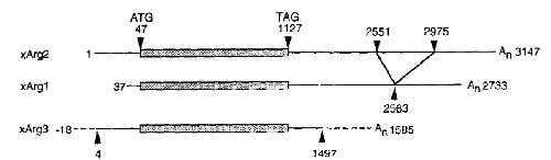 The lengthso f cDNAclones are 2.7,3.1, an1d. 6 kilobase pairsf or argl, arg2, and arg3, respectively. Each clone has ano pen reading framee ncoding