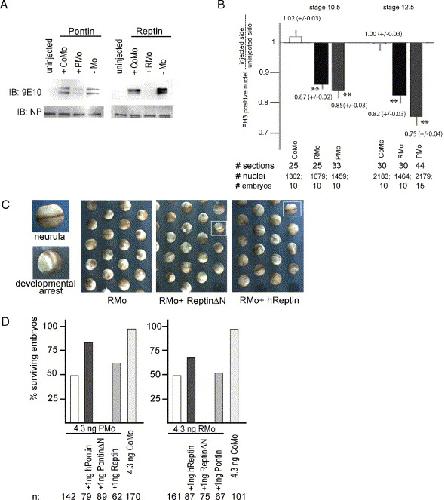 Fig. 3. xPontin and xReptin are required for proliferation and development beyond the gastrula stage in Xenopus embryos (A) Immunoblots documenting expression of xPontin and xReptin in early neurulae upon injection of the indicated morpholino oligonucleotides into two-cell stage embryos. Both blastomeres were co-injected with 1 ng myc-tagged Pontin or Reptin mRNA and 4.3 ng of the indicated morpholinos, PMo: antisense Pontin, RMo: antisense Reptin, CoMo: corresponding control morpholino, -Mo: without morpholino. Upper panel shows an immunoblot of embryo lysates stained with 9E10 antibody for the exogenous Pontin and Reptin. Lower panel shows staining for nucleoplasmin (NP) used as loading control. B) Quantification of PH3 positive nuclei in stage 10.5 and 12.5 embryos co-injected at the 2-cell stage with the indicated morpholino oligonucleotides and GFP mRNA. Values are given in relation to the non-injected side. The percentage of positive nuclei at the non-injected side was set to 1. ** p-value in student t-test < 0.005, ânsâ p-value in student t-test > 0.02. (C) Phenotype of embryos, in which both blastomeres of two-cell stage embryos were injected with Reptin antisense morpholino (RMo: 4.3 ng) alone or with the indicated mRNAs (1 ng RNA each). Phenotypes were analysed at early neurula stage. Left: higher magnification of embryos labelled by white rectangles shown on the right side. Note: lack of the dark line reveals the missing neural tube in embryos with developmental arrest. (D) Percentage of surviving embryos upon injection of 4.3 ng of indicated morpholino oligonucleotides and mRNAs (1 ng each). The numbers of injected embryos are indicated at the bottom.