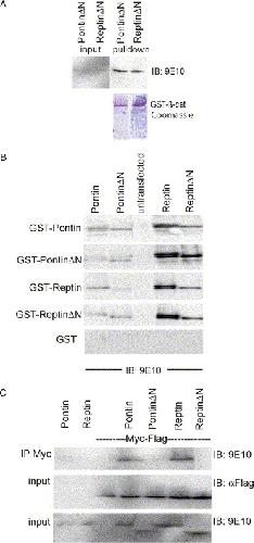 Fig. 5. Deletion of the N-terminus in xPontin and xReptin affects c-Myc binding but not homo- or heterodimerization. (A) GST pulldown assays reveal that N-terminal truncated Pontin and Reptin constructs bind to GST-β-catenin. NOP lysates of transfected HEK 293 cells were incubated with bacterially expressed immobilized GST-β-catenin. Bound proteins were eluted and stained in immunoblots with the 9E10 antibody for the presence of transfected xPontin and xReptin constructs. (B) GST pulldown assays documenting homo- and heterodimerization of full-length xPontin, xReptin and their N-terminally truncated mutants. NOP lysates corresponding to 5Ã106 HEK293 cells transfected with the indicated constructs were incubated with bacterially expressed immobilized GST-Pontin, GST-PontinδN, GST-Reptin, GST-ReptinδN or GST alone. Bound proteins were eluted and stained in immunoblots with the 9E10 antibody for the presence of exogenous xPontin and xReptin constructs. The transfected Reptin appears as double band. Most likely, the faster migrating band is due to protein degradation. (C) Binding of Pontin and Reptin to Myc requires the amino terminus. Shown are co-immunoprecipitation experiments from HEK293 cells transfected with flag-tagged murine Myc and 9E10 myc-tagged xPontin and xReptin constructs as indicated. Note: 9E10 specifically recognizes human (myc-tag) but not murine Myc protein. Lysates were precipitated with α-flag-antibody (âIP Mycâ); immunoblots were probed with the 9E10 antibody (IB 9E10) for the presence of exogenous xPontin and xReptin constructs or with α-flag-antibody (IB αflag) for exogenous c-Myc. Co-immunoprecipitations were done according to (Herold et al., 2002).
