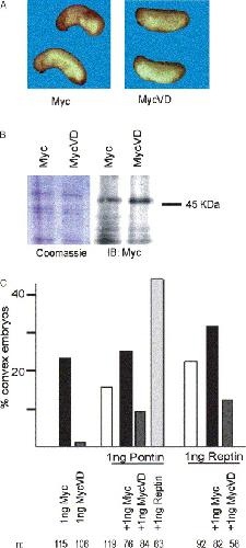 Fig. 6. c-Myc but not the c-MycV394D mutant deficient in Miz-1 binding phenocopies xPontin and xReptin. (A) Representative examples of embryos dorsally injected with 1 ng mRNA encoding either human c-Myc or human c-MycV394D (MycVD). (B) Coomassie stained gel and an immunoblot against human c-Myc-protein. The gel was loaded with lysates of injected embryos, documenting equal expression of the constructs. (C) Percentage of embryos showing a convex phenotype after injection of 1 ng RNA encoding the indicated proteins into both dorsal blastomeres of 4-cell stage embryos. Co-injection of c-Myc either with xPontin or xReptin increased the number of convex shaped embryos while c-MycVD decreased it. Note: xPontin and xReptin co-injection shows an additive effect compared to single injections either of xPontin or xReptin.