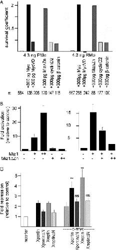 Fig. 7. Pontin and Reptin are co-repressors of c-Myc/Miz-1. c-Myc and dominant negative Miz-1 but not the c-MycV394D mutant, cyclin D2 or β-catenin rescue morpholino induced developmental arrest. Quantification of embryonic survival upon injection of the indicated constructs into both blastomeres of two-cell stage embryos. Phenotypes were analysed at early neurula stage. The survival coefficient is defined as the percentage of surviving embryos co-injected with the indicated constructs relative to morpholino-alone injected embryos of the same egg batch. Thus, the survival coefficient normalizes the different quality of egg batches so that a direct comparison of the injections is possible. Depending on the egg batch, PoMo led in 29â70% of the injected embryos to gastrula arrest, ReMo in 33â71%. The numbers of injected embryos are indicated at the bottom. (B) MizδZn is a dominant negative mutant of Miz-1. Shown are transient transfection assays in HeLa cells using the indicated CMV-based expression constructs. The p21 promoter was used as a reporter. The left panel documents the inability of MizδZn to activate the p21 reporter; the right panel documents the dominant negative activity towards wtMiz-1. (C) Xpontin and xReptin but not their N-terminal mutants enhance p21 repression in Hek293 cells in normal and co-transfected c-Myc background.