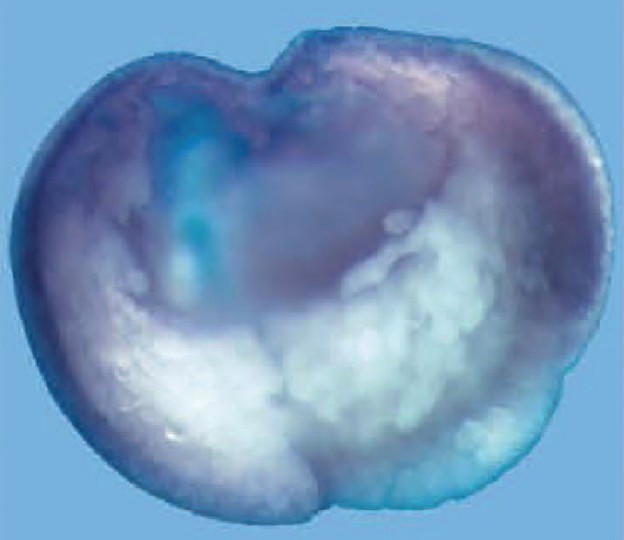 zbtb17 (zinc finger and BTB domain containing 17) gene expression in bisected Xenopus laevis/ tropicalis embryo, mid-sagittal section, assayed via in situ hybridization, NF stage 11, dorsal left, animal pole up.