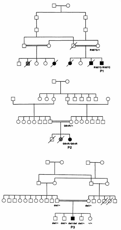 acid substitution (R187C or G64R) or single nucleotide deletion (del);