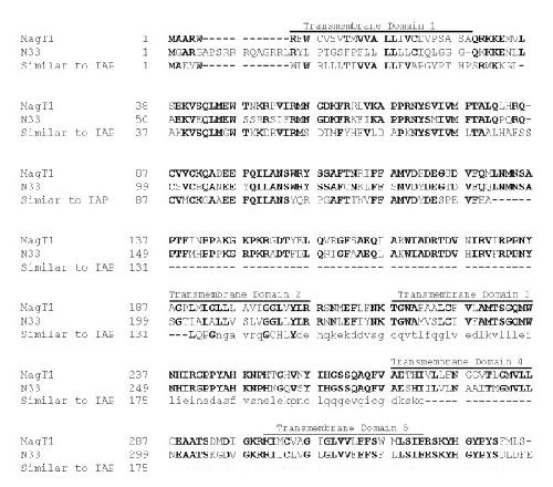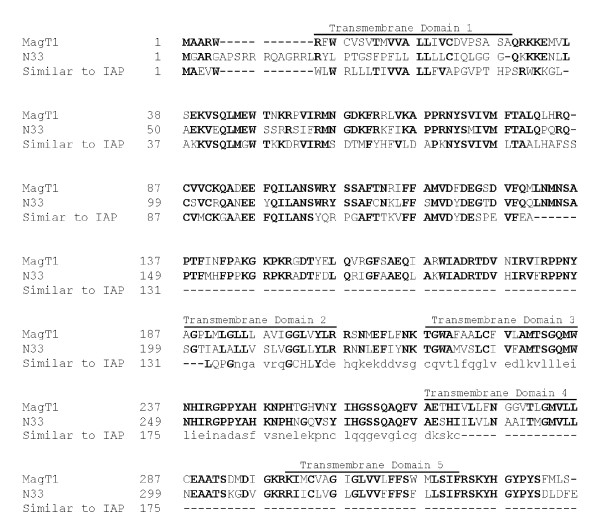 Figure 1. Primary amino acid sequence of human hMagT1. Human MagT1 was aligned with human candidate tumor suppressor sequence, N33, and the human implantation associated protein, designated IAP. The six predicted transmembrane domains are overlined and numbered. The amino acid numbers corresponding to the MagT1 protein are shown on the left side.