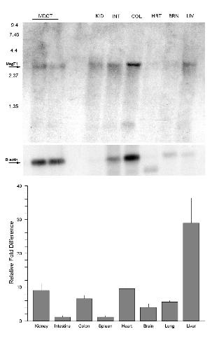 Figure 2. Tissue distribution of mMagT1 mRNA. A, Northern blot analysis of mMagT1 mRNA in MDCT cells or mouse tissues. Tissues were harvested and poly(A)+ RNA prepared by standard techniques. Each lane was loaded with 8 µg of poly(A)+ RNA. The same blot was stripped and hybridized with 32P-labeled β-actin as a control for loading. B, real-time reverse transcription PCR analysis of mMagT1 RNA in tissues harvested from mice maintained on normal magnesium diet. mMagT1 and murine β-actin RNA was measured with Real-Time RT PCR (AB7000TM, Applied Biosystems) using SYBR GreenTM fluorescence. Standard curves for MagT1 and β-actin were generated by serial dilution of each plasmid DNA. The expression level of the mMagT1 transcript was normalized to that of the mouse β-actin transcript measured in the same 1.0 μg RNA sample. Results are normalized to the small intestine and expressed as fold-difference. Mean mRNA levels of kidney, colon, heart, brain, lung, and liver tissues were significantly greater, p>0.01, than small intestine ans spleen.