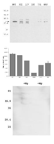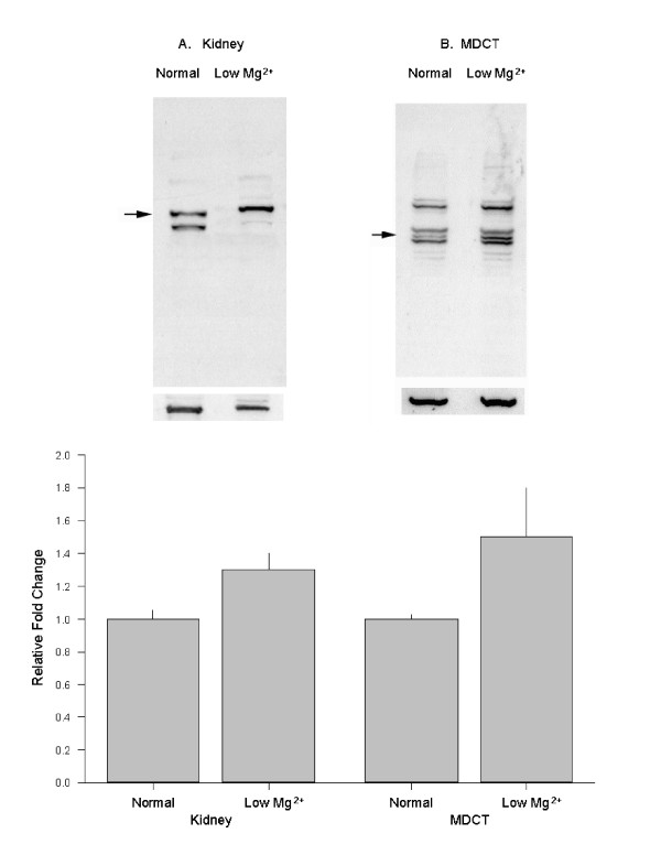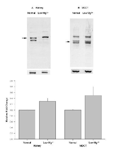 Figure 13. MagT1 protein expression is responsive to magnesium. Western blots of membrane proteins from cells and tissues as described under “Experimental Procedures”. MagT1 bands were probed with anti-MagT1antibody. Data are from four Western blots performed on five separate cultures or animals in each group maintained on low and normal magnesium.