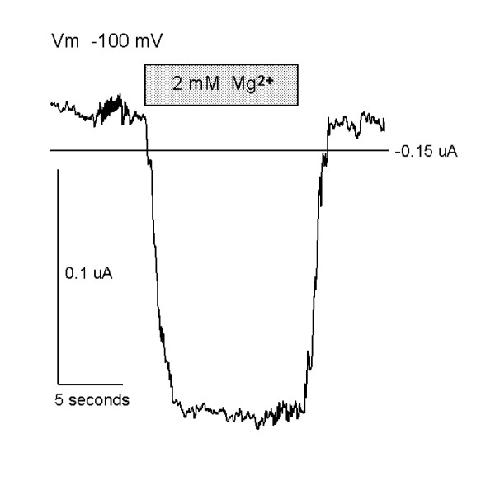 Figure 4. Mg2+-evoked currents in Xenopus oocytes expressing hMagT1 RNA transcripts. Current was continuously monitored in a single oocyte expressing hMagT1 clamped at -100 mV and superfused for the period indicated, first with modified Barth’s solution containing 0 mM magnesium then with 2.0 mM magnesium and finally returning to magnesium-free solution.