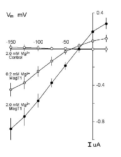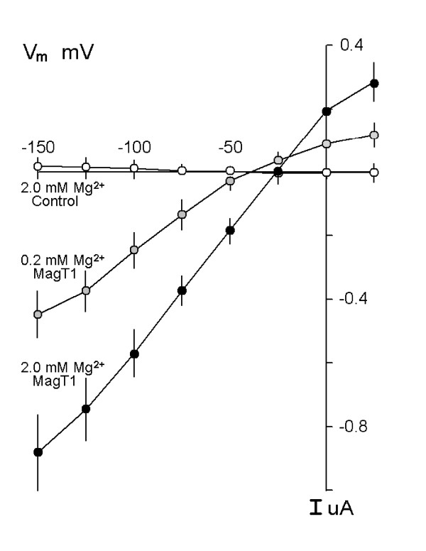Figure 5. Mg2+-evoked currents in Xenopus oocytes expressing hMagT1. Current-voltage relationships obtained from linear voltage steps from -150 mV to +25 mV in the presence of Mg2+-free solutions or those containing the indicated concentrations of MgCl2. Oocytes were clamped at a holding potential of -15 mV and stepped from -150 mV to +25 mV in 25 mV increments for 2 s at each of the concentrations indicated. Shown are average I-V curves obtained from control H2O-injected (n = 13) or MagT1-expressing (n =/>7) oocytes. Note, the positive shift in reversal potential, indicated by arrows, with increments in magnesium concentration. Values are mean ± SEM of observations measured at the end of each voltage sweep for the respective Mg2+ concentration.