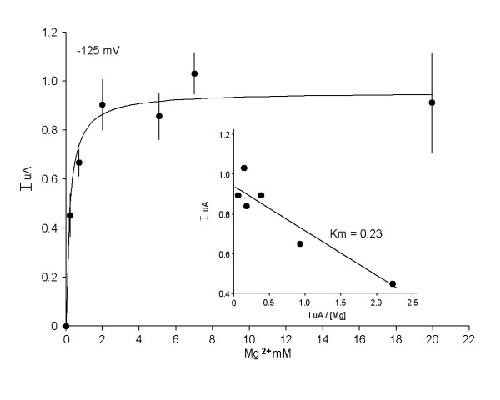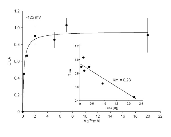 Figure 7. Summary of concentration-dependent Mg2+-evoked currents in MagT1-expressing oocytes using a holding potential of -125 mV. Mean ± SEM values are those given in Fig. 1A. Inset illustrates an Eadie-Hofstee plot of concentration-dependent Mg2+-evoked currents demonstrating a Michaelis constant of 0.23 mM.