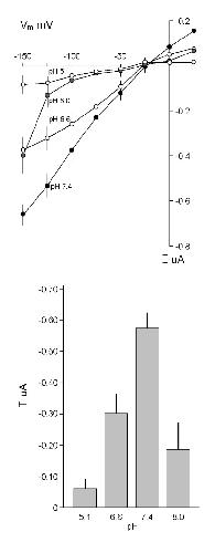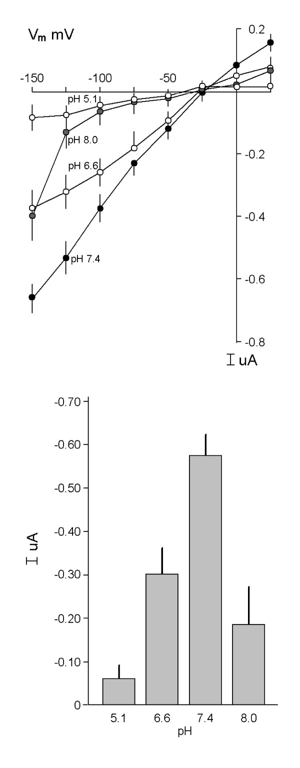 Figure 8. Characterization of Mg2+-evoked currents in Xenopus oocytes expressing hMagT1. A, effect of pH on Mg2+-evoked currents. Currents were measured in standard solutions containing 2.0 mM MgCl2 at the pH values indicated. B, summary of mean currents with external pH at a holding potential of -125 mV. Mg2+ did not evoke currents in H2O-injected oocytes at any of the pH values tested.