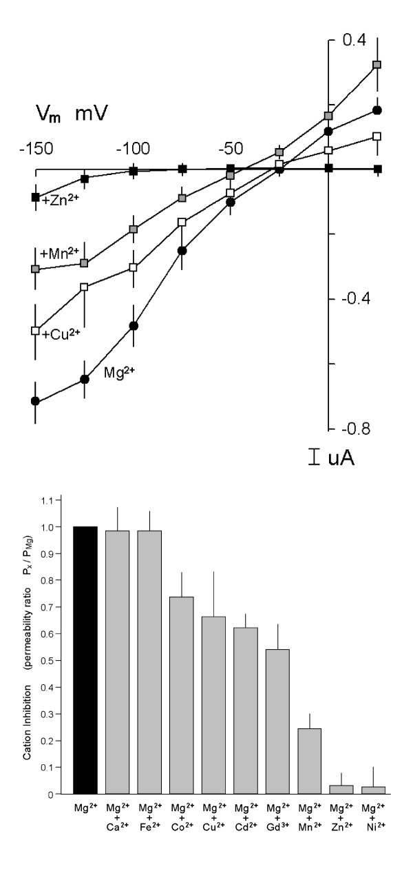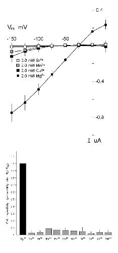 Figure 9. Substrate specificity of MagT1 following application of test cations, 2.0 mM, in the absence of external Mg2+. For clarity, only Mg2+,Cu2+, Mn2+, and Sr2+ are represented in panel A. Oocytes were clamped at a holding potential of -15 mV and stepped from -150 mV to +25 mV in 25 mV increments for 2 s for each of the cations. Values are mean ± SEM of currents measured at the end of each voltage sweep for the respective divalent cation. B, summary of permeabilities of the tested divalent cations. Figure illustrates average permeability ratios (Erev for tested cation relative to Erev for Mg2+) given in Fig. 9A.