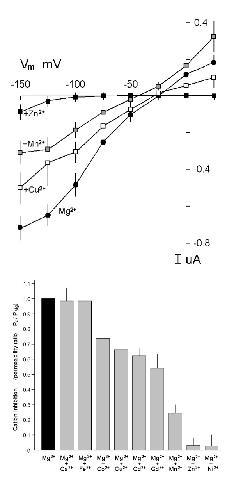 Figure 10. Inhibition of MagT1-mediated currents. A,inhibition of Mg2+-evoked currents with 0.2 mM test cation in the presence of external 2.0 mM Mg2+. For clarity, only Cu2+, Mn3+, and Zn2+ relative to Mg2+ are represented. Values are mean ± SEM of currents measured at the end of each voltage sweep for the respective cation. B, summary of inhibition by multivalent cations of Mg2+ currents based on the change in Erev represented in Fig. 10A. The inhibitor was added with MgCl2 and voltage-clamp was performed about 5 min later.