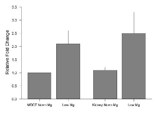 Figure 12. MagT1 mRNA expression is responsive to magnesium. Where indicated MDCT cells were cultured in normal (1.0 mM) or low (<0.01 mM) magnesium media for 16 h. Kidney cortical tissue was harvested from mice on normal (0.05% by weight) or low magnesium (<0.01%) diets for 5 days. MagT1 and murine β-actin RNA was measured with Real-Time RT PCR (AB7000TM, Applied Biosystems) using SYBR GreenTM fluorescence. Data is from 10-12 PCRs performed on five separate cultures or animals in each group maintained on low and normal magnesium.