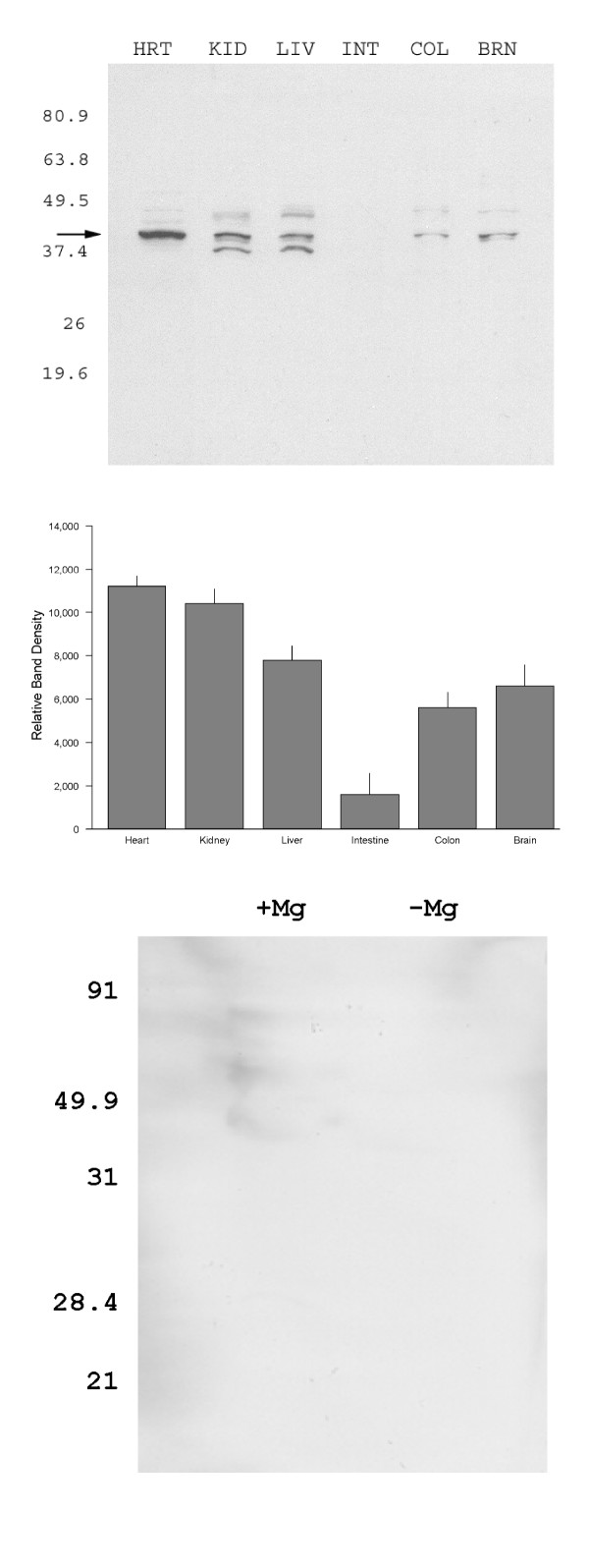 Figure 3. Tissue distribution of mMagT1 protein. A. Western blots of membrane proteins from tissue extracts. Extracts were prepared from tissues as described under “Experimental Procedures”. MagT1 bands were probed with anti-MagT1antibody. Molecular sizes are expressed in kDa of pre-stained standards are shown on the left of each of the representative blots. B, summary of 38 kDa MagT1 protein in 15 μg total protein from various mice tissues. Data were obtained from 3 different mice and are indicated as the mean ± SEM. C, specificity of anti-MagT1 antibody. The fractions isolated from normal and magnesium-depleted MDCT cells were blotted with MagT1 antibody and MagT1 antibody preadsorbed with excess antigen peptide. The signal was reduced to background levels when preadsorbed antibody was used indicating that the antibody was specific to MagT1.