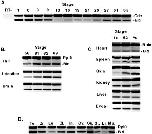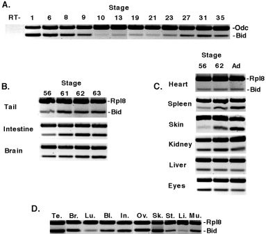 Figure 1. Expression levels of Bid transcripts in Xenopus. AâD: Bid mRNA detection by reverse transcriptase-polymerase chain reaction analysis on embryos of stages 1 to 35 (A; Niewkoop and Faber,1994), on several tissues throughout metamorphosis (B,C), and adult tissues (C, right column and D). L8 ribosomal protein (rpl8) or ornithine decarboxylase (odc) transcripts were used for normalization. Ad, adult; Te, testis; Br, brain; Lu, lung; Bl, blood; In, intestine; Ov, ovary; Sk, skin; St, stomach; Li, liver; Mu, muscle.Download figure to PowerPoint |