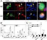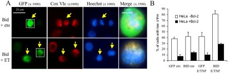 Figure 3. Xenopus laevis BID accelerates the drop of δÏm during TNF-α-induced apoptosis but not during etoposide-induced apoptosis. Fluorescence analysis (original magnification, Ã1,000) of HeLa-Bcl-2 cells transfected with CMV-BIDGFP in the presence of etoposide: eto (upper line)or Emetine + TNF-α: E/TNF (lower line). A: Arrow in Hoechst panel (upper line) shows nuclear condensation in the presence of etoposide. Boxed cells at a magnification of Ã1,000 (left panel) are merged (original magnification, Ã3,500) to show the cytosolic (BID + eto) or mitochondrial (BID + ET) distribution of BIDGFP (right panel). B: Mitochondrial membrane potential (δÏm) of Bcl2-Hela cells transfected by green fluorescent protein (GFP) or BIDGFP-expressing vectors assessed by flow cytometry.Download figure to PowerPoint |