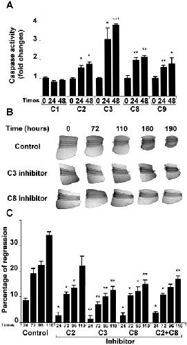 Figure 7. Caspases-2 and -8 inhibitors inhibit tail regression. A: Effect of T3 (10 nM) during 24 hr or 48 hr on caspases activities in ex vivo cultured tails from wild-type siblings tadpoles killed at stage NF55. Caspase activities were determined using fluorometric dosage. B,C: Effect of T3 (10 nM) with or without caspase inhibitors (100 μM) during 24 hr or 48 hr on tail regression of ex vivo cultured tails from wild-type siblings tadpoles killed at stage NF55. Tails were photographed at different times of T3 treatments (B), and the regression of the area of each tail was calculated (C). Means and SEM are shown, *P < 0.05; **P < 0.01; *P < 0.001; n = 3 for caspase dosage, n = 5 for tail regression. The figures represent one of two independent experiments with similar results.Download figure to PowerPoint |