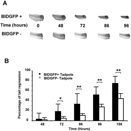 Figure 8. BID overexpression accelerates tail regression. Ex vivo cultured tails in the presence of T3 (10 nM) from BIDGFP-positive and -negative siblings tadpoles killed at stage NF55. Tails were photographed at different times of T3 treatment (A) and the area of each tail was determined (B). Histogram represents quantification (Means ± SEM) of the regression of the area of eight BIDGFP positive and negative tails. *P < 0.05 **P < 0.01.Download figure to PowerPoint |