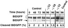 Figure 9. Caspase 8 activity is required for BIDGFP cleavage during tail regression. Effect of caspase inhibitors (100 μM) on tail regression of ex vivo cultured tails from wild-type sibling tadpoles killed at stage NF55, in the presence of T3 (10 nM) during 24 hr or 48 hr. Western blot analysis was performed on total proteins extracted from tails. Green fluorescent protein (GFP) -tagged proteins were detected using a GFP antibody (Roche). The asterisk indicates an unspecific band. The percentage of cleaved BIDGFP was determined by densitometry using Image J (Wayne Rasband, NIH). Caspase-2 inhibitor-treated sample and the control on the right were run on a separate gel. The data represent one of two independent experiments that gave similar results.Download figure to PowerPoint |