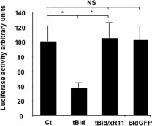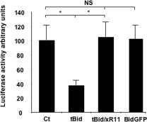 Figure 4. Validation of the protective effect of xR11 against tBID-induced apoptosis by somatic gene transfer in tadpole muscle cells. Cell survival measured by the luciferase activity (RLU) in muscle extracts 72 hr after transfection into the dorsal muscle of stage 56 tadpoles. Each group was injected with 200 ng of pcDNA3-LUC. In the Ct group, 1 ng of CMV-GFP and 1 μg of empty pCDNA3 were coinjected. In the tBID group, 1 ng of cmv-gfptbid and 1 μg of empty pCDNA3 were coinjected. In tBid/xR11 group, 1 ng of cmv-gfptbid and 1 μg of cmv-xr11 were coinjected. In the BID group, 500 ng of cmv-gfpbid and 500 ng of empty pCDNA3 were coinjected. Means ± SEM are given; n > 4 in each group. *P < 0.05; **P < 0.01; ***P < 0.001. The experiment was repeated three times providing similar results.Download figure to PowerPoint |