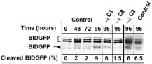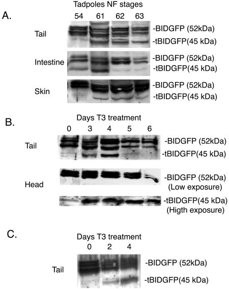 Figure 5. BIDGFP cleavage during induced or spontaneous metamorphosis. Western blot analysis on total proteins extracted from metamorphic CMV-BIDGFP transgenic tadpoles tissues using a GFP antibody (molecular probes). A: Detection of the BID 45-kDa truncated form (tBIDGFP) during natural metamorphosis. Stage 54, premetamorphosis; stages 61 to 63, climax of metamorphosis. B: Detection of tBIDGFP in heads and tails of transgenic CMV-BIDGFP tadpoles in premetamorphosis (stage 42) maintained in water supplemented with 10 nM T3 for a week. For the heads, autoradiography exposure was 2 min for the BIDGFP band and increased to 120 min to enhance the faint tBIDGFP band (lower lane). C: tBIDGFP detection in ex vivo cultured tails of transgenic CMV-BIDGFP tadpoles (stage 57) 2 days and 4 days after continuous 10 nM T3 incubation.Download figure to PowerPoint |