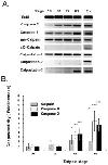 Figure 6. mRNA Expression and activity levels of Xenopus caspases, calpain, and calpastatin during tail regression. A: Reverse transcriptase-polymerase chain reaction (RT-PCR) analysis performed on metamorphic tails at the indicated developmental stages (stage 56, premetamorphosis; stages 61 to 63, climax of metamorphosis). L8 ribosomal protein transcript was used to normalize the amplification products. Positives controls (C+) are analyzed by RT-PCR on laid eggs with the following exception: for Cl2-Calpain and Caspase 8, RT-PCR was performed on adult stomach, and for Calpastatin-3, RT-PCR was performed on stage 63 metamorphic tails. B: Fluorometric analysis of calpain and caspases-2 and -8 activities in tadpoles tails before (stage 54) and during metamorphosis (stages 58, 62, 63). Means ± SEM are given; n > 5 in each group. *P < 0.05; **P < 0.01; ***P < 0.001, compared with stage 54. The figures represent one of two independent experiments that gave similar results.Download figure to PowerPoint |