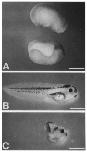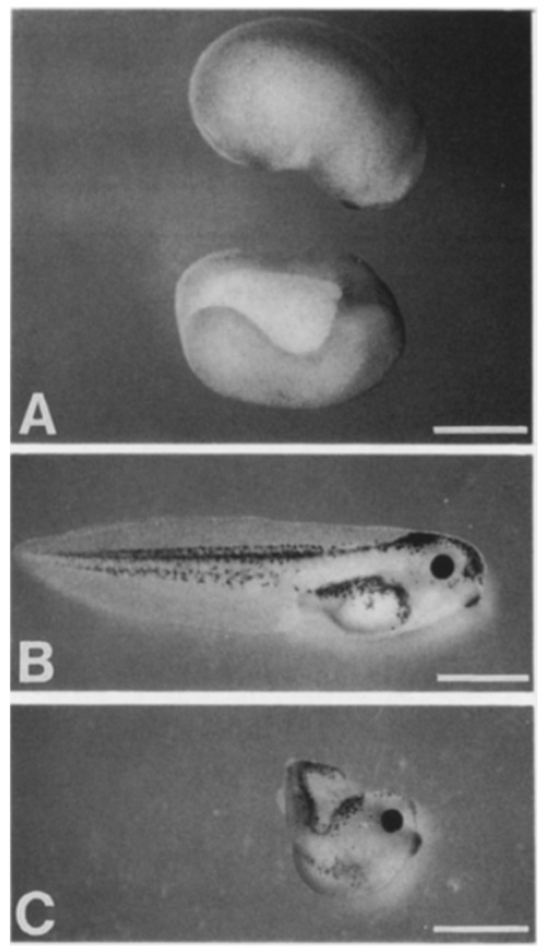 that end dorsally behind the head (arrows). (B) Control stage 20 embryos. (C) At stage 47, in comparison with a control embryo (top),