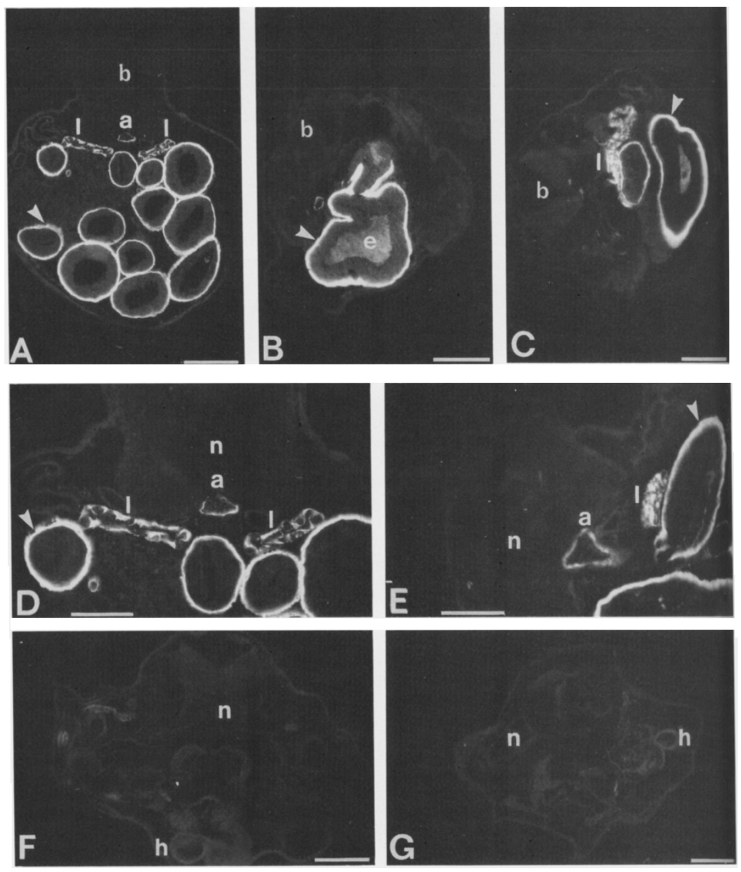 b, brain; n, notochord; 1, lung. Scale bar in A, B, C, F, and G, 0.3 mm; scale bar in D and E, 0.6 ram.