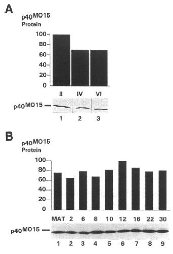 Figure 2. Steady-state levels of p40MOlS in oocytes and embryos. (A) Proteins from 25 stage II oocytes (lane 1), 12.5 stage IV oocytes (lane 2), and 2.5 stage VI oocytes were separated by SDS-PAGE and analyzed by Western blotting using M015-specific immune serum and ECL detection (bottom). The relative amounts of p40MOI5 present in each sample were quantitated by densitometry and plotted using an arbitrary scale of 1-100. (B) Proteins from five progesterone-matured stage VI oocytes (lane 1), and five stage 2, 6, 8, 10, 12, 16, 22, and 30 embryos (lanes 2-9) were separated by SDS-PAGE and analyzed by Western blotting using M015-specific immune serum and ECL detection as described in A. The relative amounts of p40MOl5 present in each sample were quantitated by densitometry and plotted using an arbitrary scale of 1-100. |