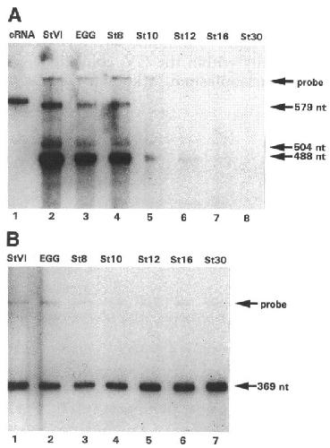 Figure 3. The relative levels of M015 mRNA in oocytes and embryos. (A) M015 cRNA (lane 1) and 10 ug of total RNA extracted from stage VI oocytes (lane 2), unfertilized eggs (lane 3), and stage 8, 10, 12, 16, and 30 embryos (lanes 4-8) were annealed to a 689-nt 32P-labeled antisense probe from the 5'-end of M015. After RNase digestion the products were analyzed on a 4% acrylamide/urea denaturing gel. Protected fragments of the predicted size of 579 nt and shorter (504 nt and 488 nt) are indicated. (B) Two micrograms of the total RNA preparations used in A from stage VI oocytes (lane 1), unfertilized eggs (lane 2), and stage 8, 10, 12, and 16 embryos (lanes 3-7) were annealed to a 454-nt 2P-labeled antisense ornithine decarboxylase RNA probe. After RNase digestion the products were analyzed on a 4% acrylamide/urea denaturing gel. The protected fragment of the predicted size of 369 nt is indicated. |